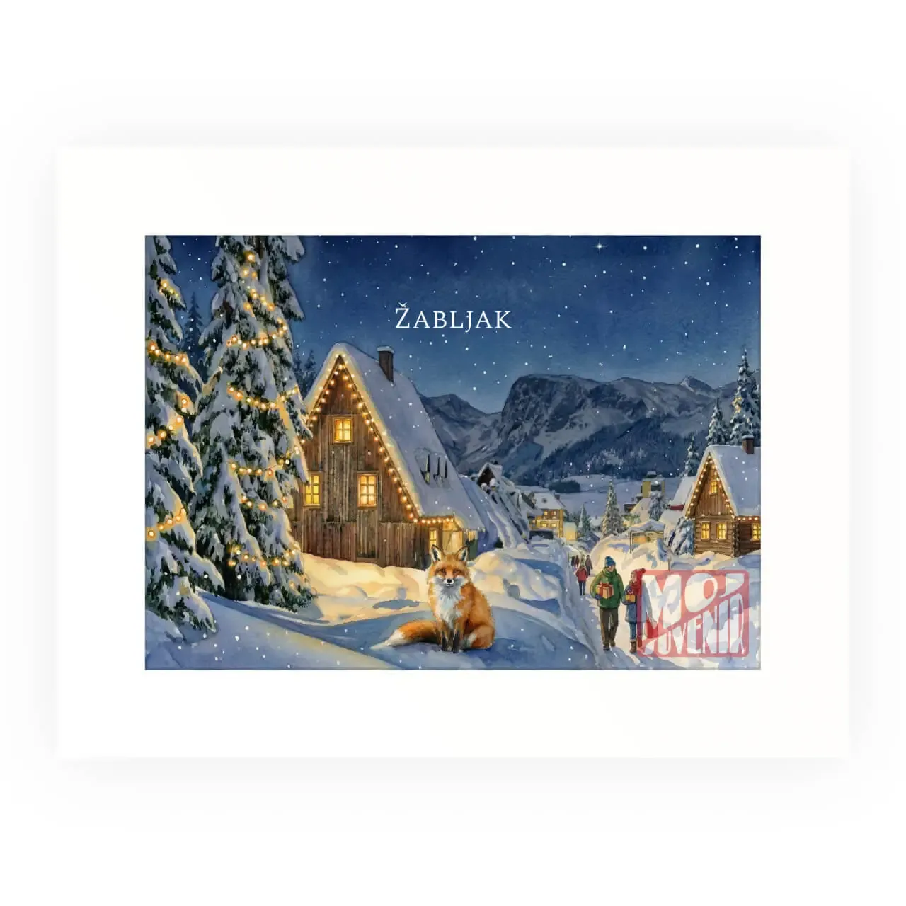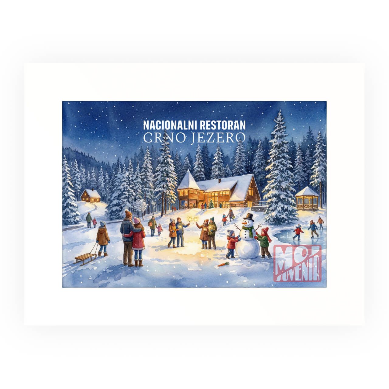 Zimski paspartu suvenir sa planinskom kućom i pejzažom Durmitora u večernjoj atmosferi.