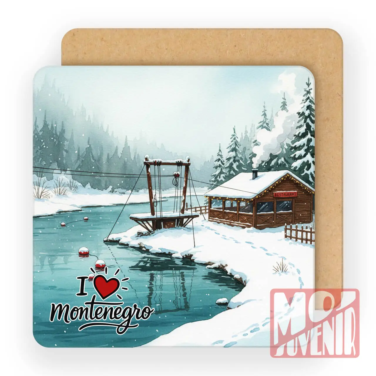 Ovaj drveni suvenir iz kolekcije Zimski Žabljak – Akvarel prikazuje mirnu zimsku scenu na obali rijeke Tare: drvenu platformu koja se koristi kao mala ručna žičara, restoran uz samu vodu i pahulje koje lagano padaju po snijegom prekrivenoj obali. Kristalno čista voda, šuma i dim iz dimnjaka stvaraju prepoznatljivu atmosferu zimskog Durmitora.