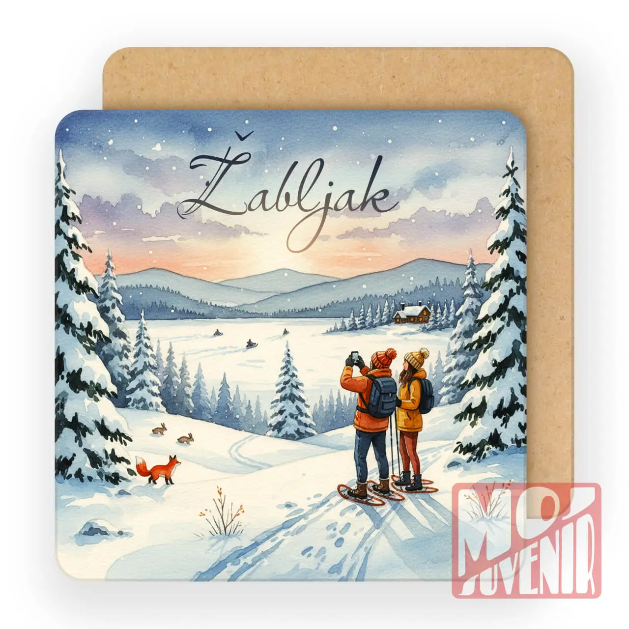Ovaj drveni suvenir iz kolekcije Zimski Žabljak – Akvarel prikazuje dvoje planinara koji uživaju u zimskom pejzažu Žabljaka: snježne staze, visoke jelke, planinska koliba u daljini i životinje koje upotpunjuju scenu – lisica i zečevi. Nježan akvarel stil daje toplinu i realističan osjećaj zimskog jutra u nacionalnom parku Durmitor.