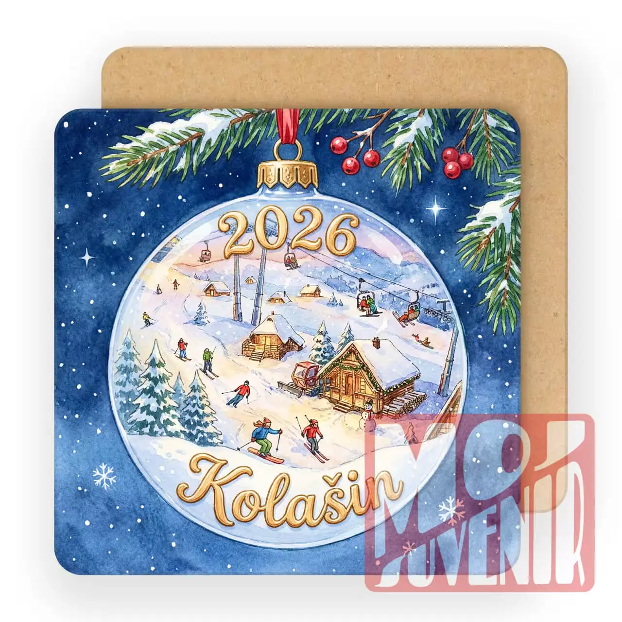 Ilustracija novogodišnje kugle sa zimskim motivima Kolašina i godinom 2026.