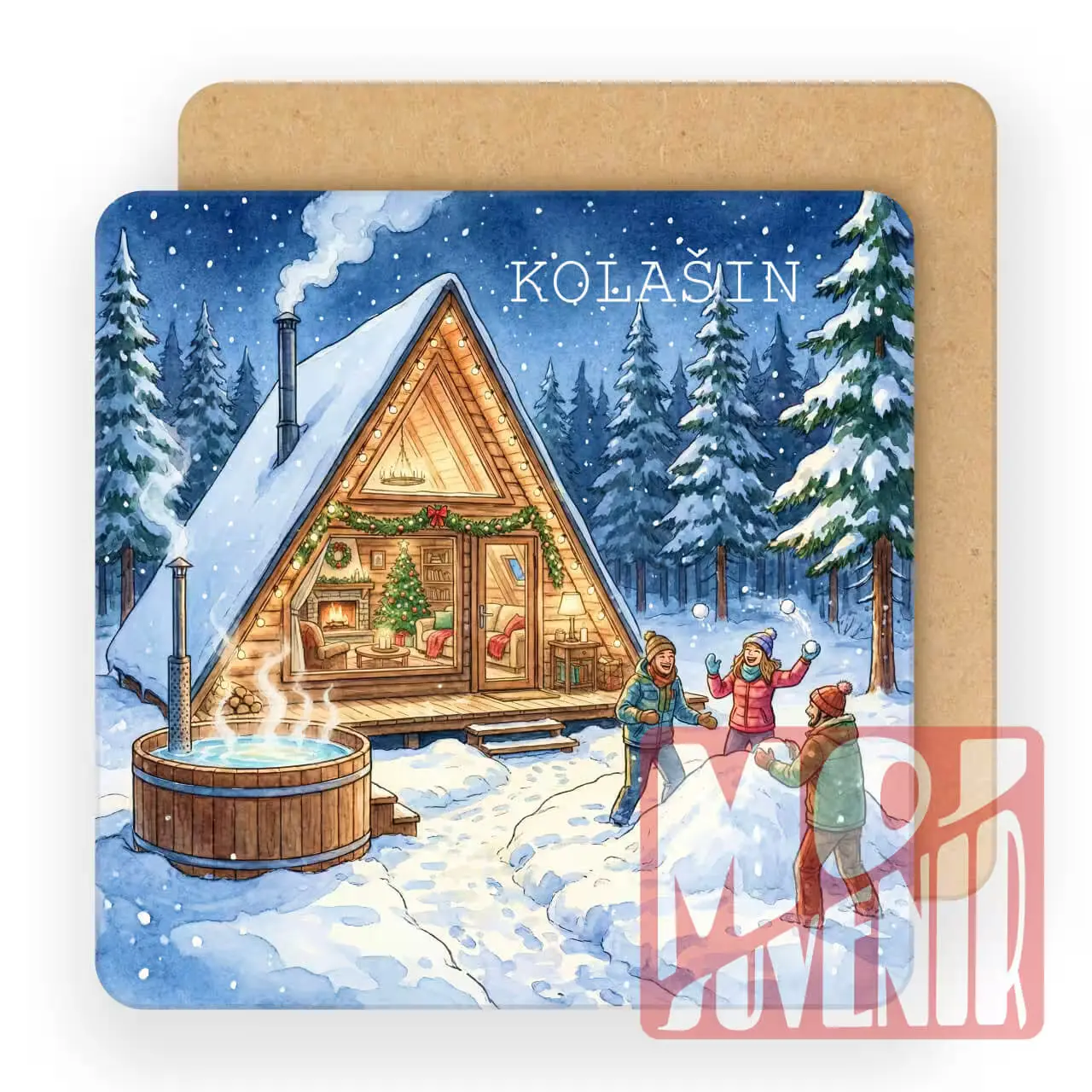 Podmetač sa zimskim motivom planinske kuće u Kolašinu.