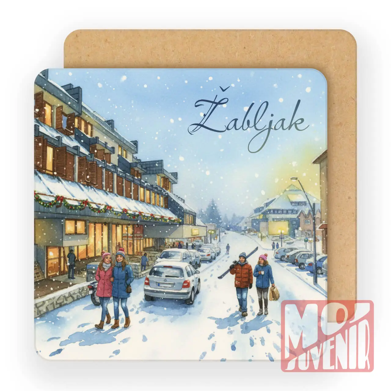 Ovaj drveni suvenir iz kolekcije Zimski Žabljak – Akvarel prikazuje živopisnu zimsku atmosferu centra Žabljaka: ukrašene fasade, zasniježene krovove, svjetla prodavnica i prolaznike koji uživaju u šetnji, kupovini i zimskim aktivnostima. Akvarel stil dodaje toplu, ručno slikanu estetiku koja savršeno prenosi duh planinskog grada.